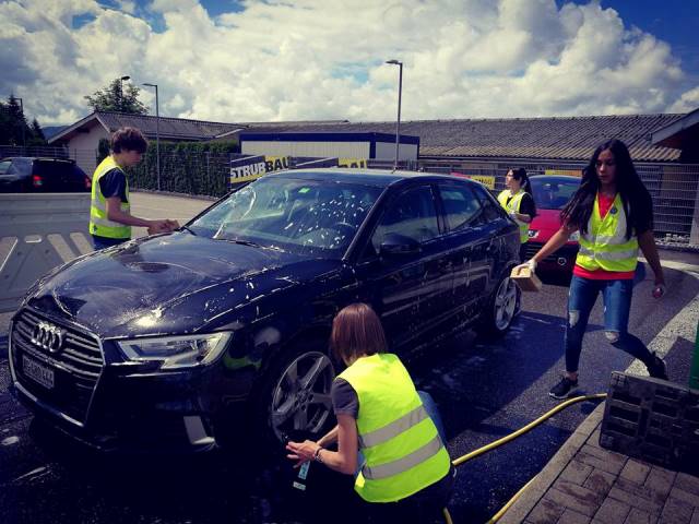 Am Samstag 20.5.17 wuschen wir von 8-17 Uhr Autos und verkauften auch Kuchen. Jede Gruppe bestand aus 3-4 Kindern und hatte zwei Einsätze. Ein Arbeiter von der Zentralgarage Hägendorf, die uns das gesamte Putzmaterial zur Verfügung stellte, zeigte uns am Morgen, wie man die Autos putzen muss. Es konnte losgehen in unserer Waschstrasse, die wir mit Absperrzäunen der Firma Strubbau AG abgesperrt hatten.
