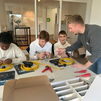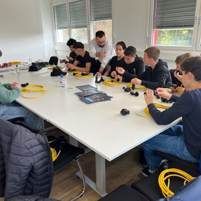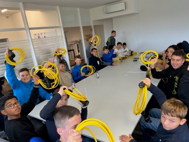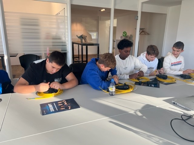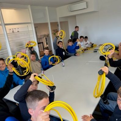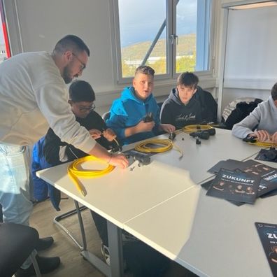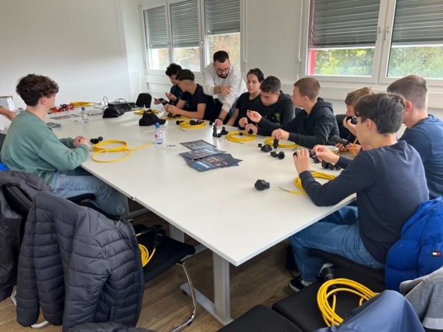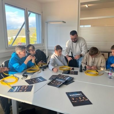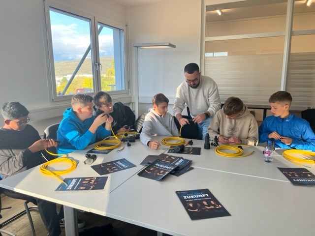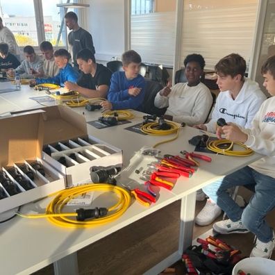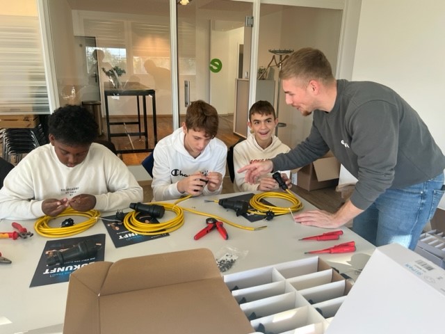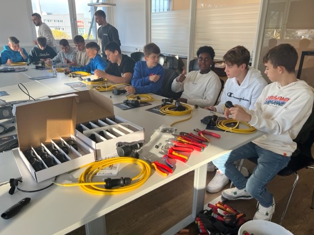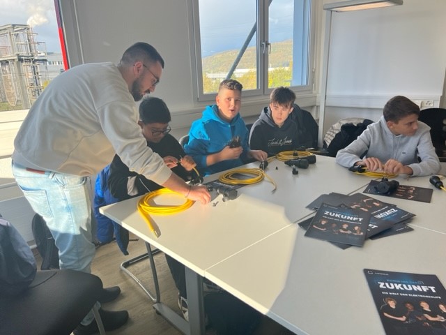 Zu einer Präsentation mit Video, einem Rundgang durch die Räume und einem Stopp beim Elektroauto an der Ladestation, gab es auch eine praktische Arbeit: Jeder Schüler hat an ein Verlängerungskabel einen Anschluss und einen Stecker montiert und durfte es nach Hause nehmen!