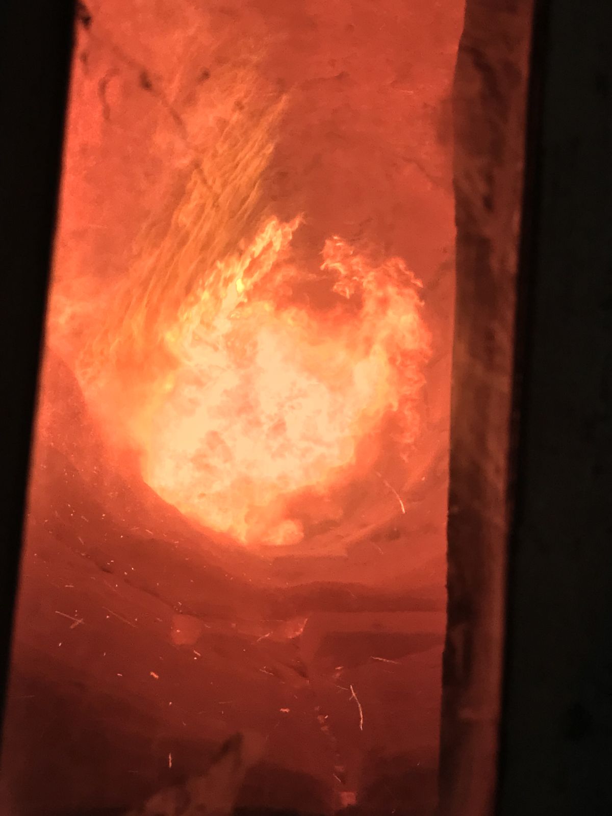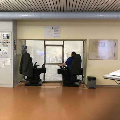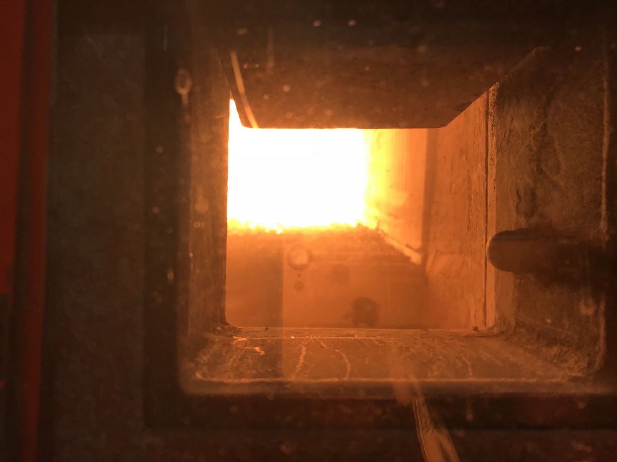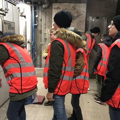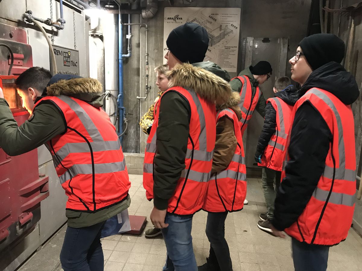 Nun mussten wir uns in einen engen Lift zwängen, der uns in den neunten Stock fuhr. Dort stand der Drehrohrofen, in den wir ebenfalls hineinschauen durften. Wir staunten nicht schlecht, weil die Flamme so aussah, als würde sie sich drehen. Ein unheimlicher Ort war der Schlackenbunker. Schlacken sind die Überbleibsel der verbrannten Abfälle. Es gibt zwei Arten von Schlacken, nämlich dunkle und helle. Die dunkle Schlacke kommt vom Klärschlamm und die helle vom Abfall im Ofen.