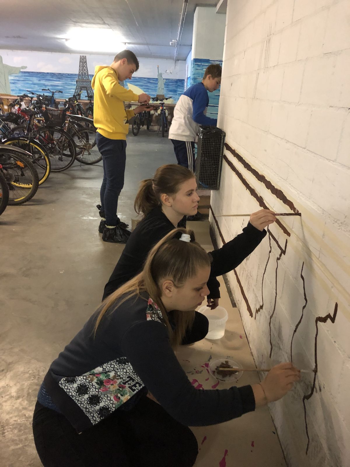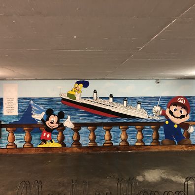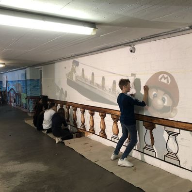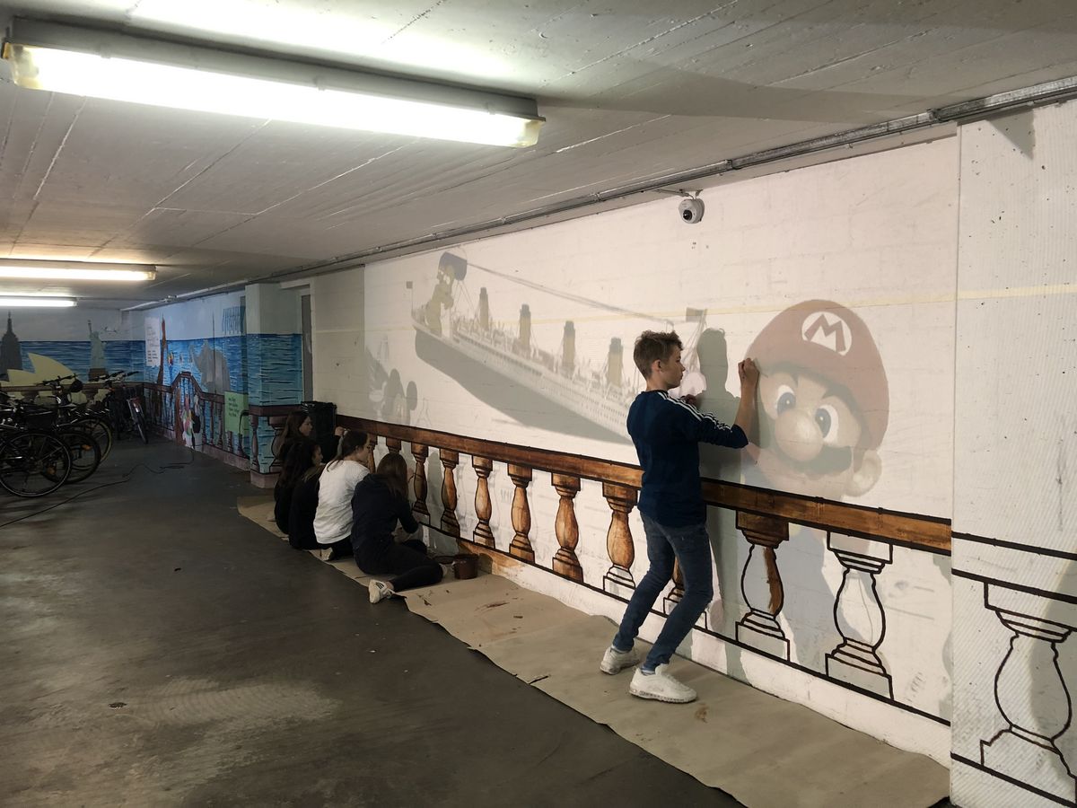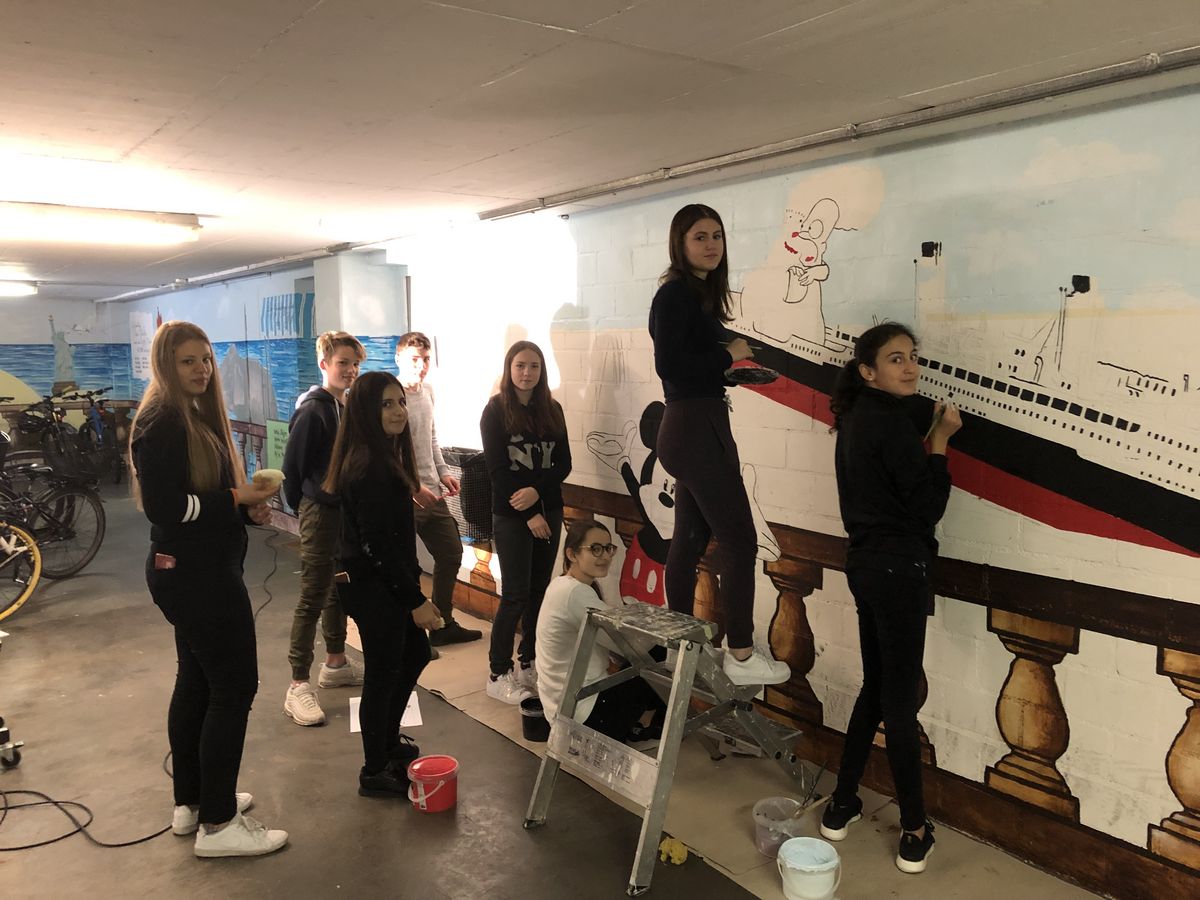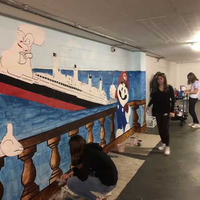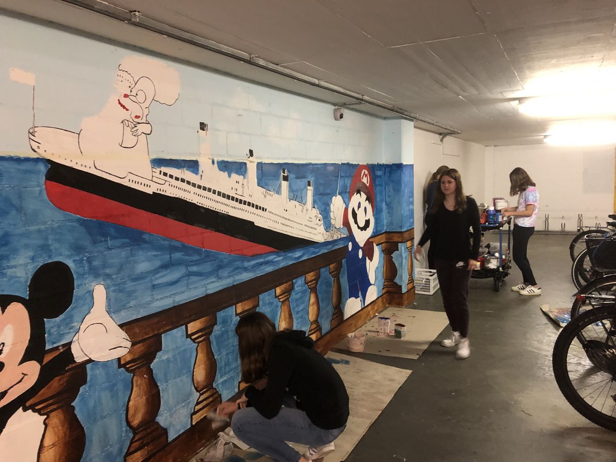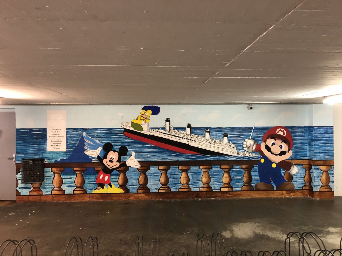 Der ganze Prozess begann erstmals mit der gemeinsamen Ideensuche. Nach kurzem Diskutieren konnten wir uns schließlich darauf einigen, dass wir die Wand mit diversen Comicfiguren und der Titanic bemalen wollen. Anschliessend zeichneten wir die Umrisse der Figuren auf die Wand und begannen mit dem Malen.