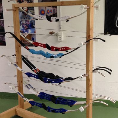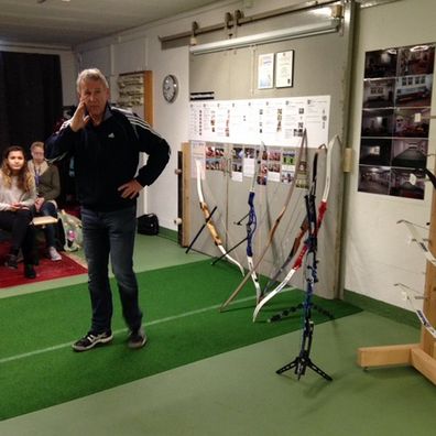 Um 8.00 Uhr trafen wir uns vor dem Bogenschiesscenter, wo die Workshopleiter Hans Peter Bühler und Bruno Glinz uns freundlich empfingen. Zusammen begaben wir uns in den Bogenschiessraum, der uns sofort in seinen Bann zog, denn auf mehreren Gestellen glänzten Bogen in allen möglichen Formen und Farben. Da gab es vom ganz einfachen Indianerbogen bis hin zum Hightech-Bogen alles zu bestaunen. Die Hightechbogen sind so kompliziert, dass wir sie gar nicht verstanden.
